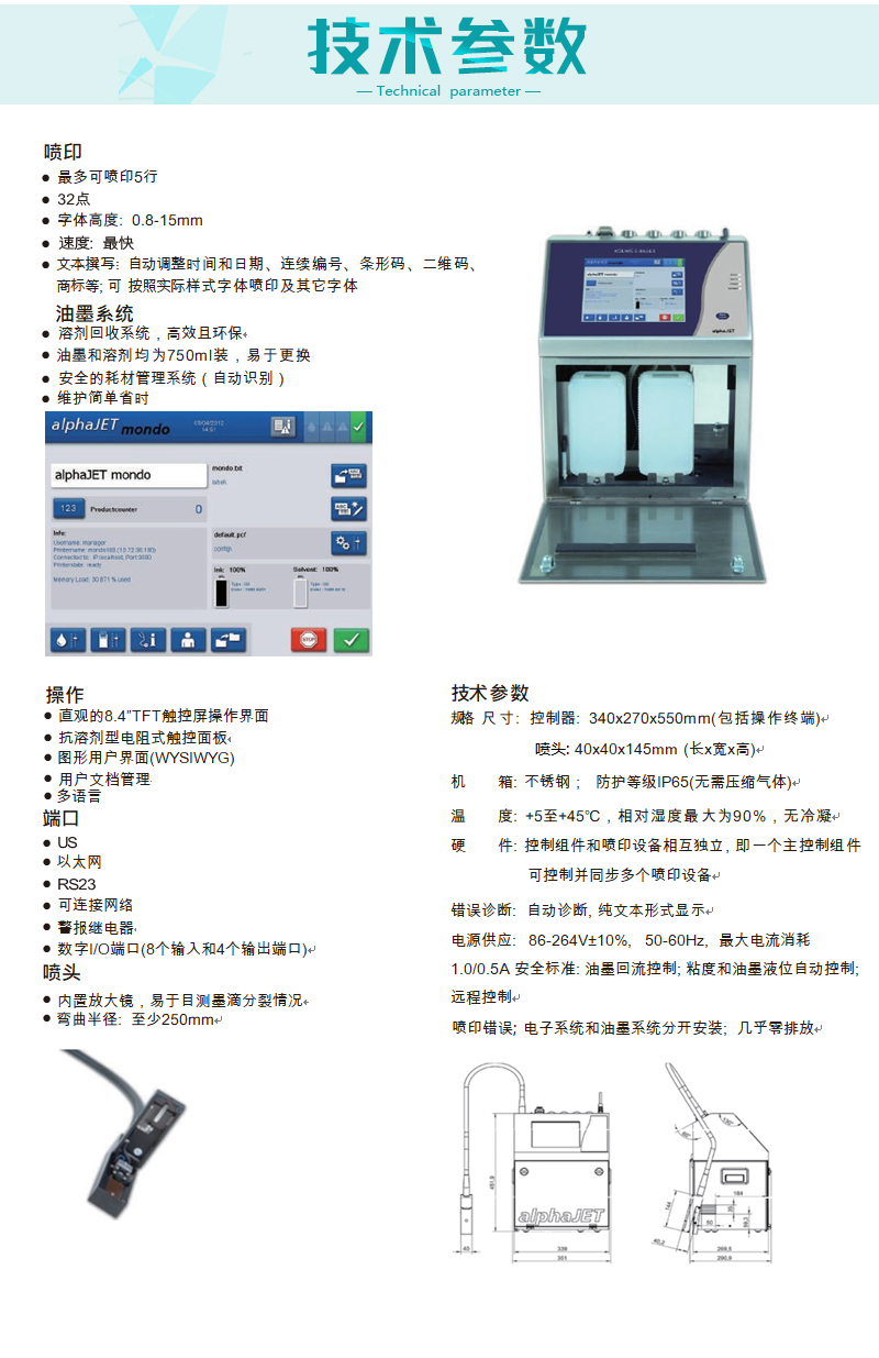 mondo小字符噴碼機具有更簡單的操作、更少量的維護、更卓越的綜合性能,專門為滿足客戶的基本噴碼需求而設計,不需要預防性維護也能長時間運行工作。整體采用模塊化設計,更換模塊快捷簡單;640x480的TFT彩色顯示屏,信息所見即所得;先進的軟件算法、準確定位每一滴墨水,高速噴印仍能達到完美的噴印效果。